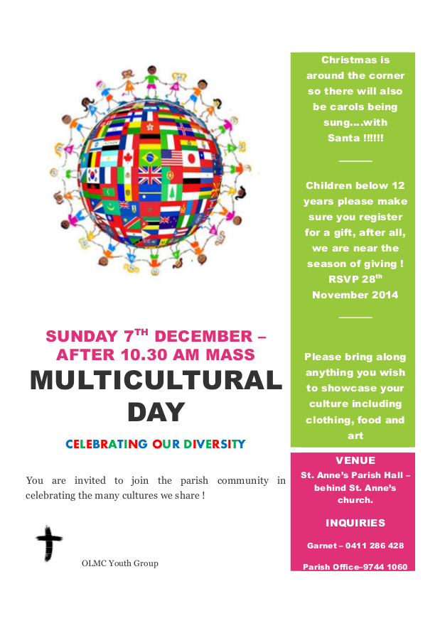 Sunday December 7 in Parish Centre after 10.30am Mass we will hold the combined Multicultural Day and Youth Christmas Carols. All are welcome to attend. Please bring a traditional plate of food to share and enjoy the various cultural performances of our multicultural community. Santa will attend the day also. If you are able to help out, please contact the Parish Office on 9744 1060.