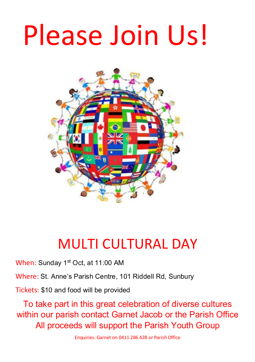PARISH MULTICULTURAL DAY This will be held on Sunday 1 October at 11am in the Parish Centre. Tickets cost $10 and food will be provided. To take part in this great celebration of diverse cultures within our parish contact Garnet Jacob or the Parish Office. All proceeds will support the Parish Youth Group.